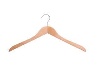 Gewinkelter Formbügel aus Lotusholz, matt lackiert, vernickelter Haken, ohne Steg, Holzstärke 12 mm, Länge 43 cm