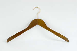 Gewinkelter Formbügel aus Buchenholz, Nuss gebeizt, vernmessingter Haken, ohne Steg, Holzstärke 13 mm, Länge 44 cm